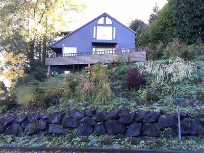 Description: This house sits above the street on a lot with extensive native plantings and large trees. It has an asymmetrical gable door with a center chimney and a lower shed-roofed bay. Windows are primarily fixed pane. The second story has a balcony with sliding glass doors and quarter-circle windows above.