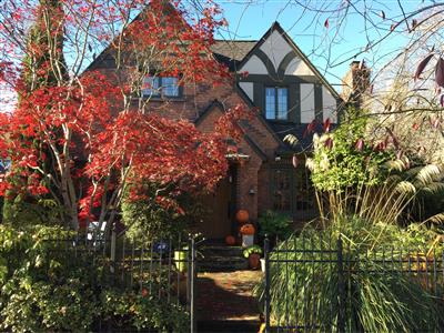 Description: This one-and-a-half story, L-shaped dwelling has a gable-and-wing roof, clad in wood shingles. It is situated on a corner lot with mature foundation plantings and trees. Cladding is generally brick with clapboard and stucco accents. The primary entry is in the corner of the L facing the front (east) facade. It has a solid wood door sheltered by a partially enclosed half- timbered, stucco-clad porch with a sloping roof, which is an extension of the front gable roofline. The front gable to the south of the entry includes a fixed 20-light divided leaded window with a distinctive spider web pattern, flanked by a pair of 8-light casement surrounds and beneath a set of curved multi- light transoms. Clapboard cladding is below the gable peak. The wing to the north of the entry features a fixed 16-light fixed divided leaded window with 8-light metal casement surrounds. The second story includes a stucco-clad gabled dormer with exposed verge boards, and a window with diamond patterning. Secondary facades include similar materials and windows as the primary facade. A secondary entry, with an arched wood door with a three-part window beneath arched brickwork, is situated on the north facade. An exterior brick chimney is on the south wall.